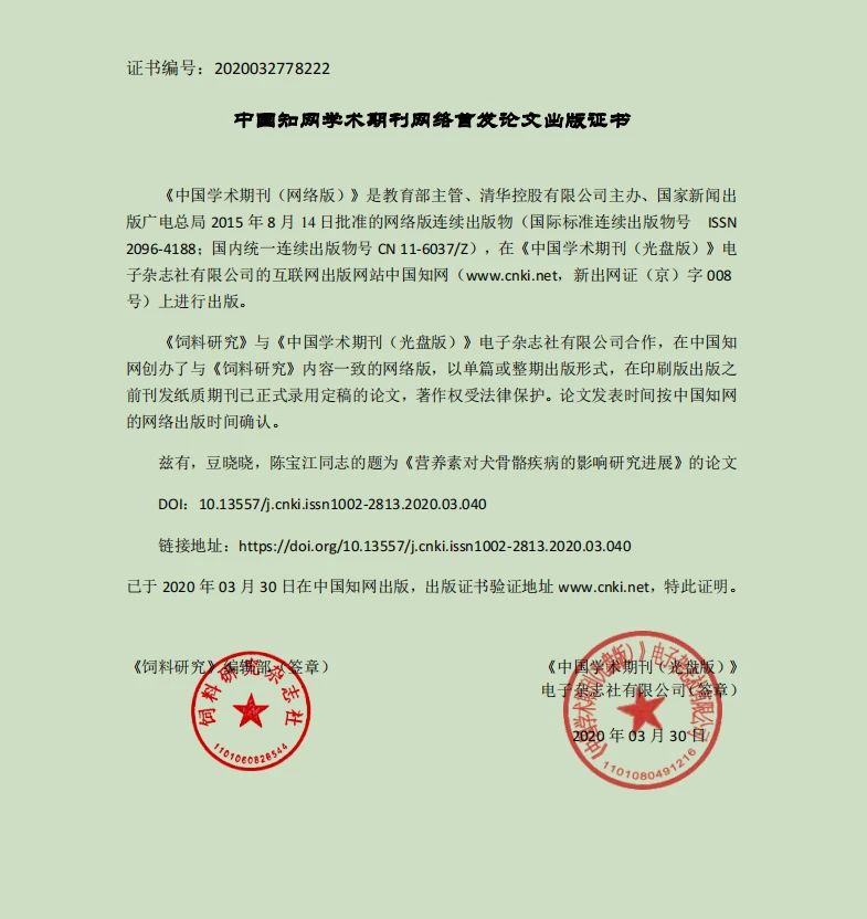 華興寵物食品研發(fā)部論文《營養(yǎng)素對犬骨骼疾病的影響研究進展》在北大核心期刊《飼料研究》上發(fā)表,并可在中國知網(wǎng)上檢索。